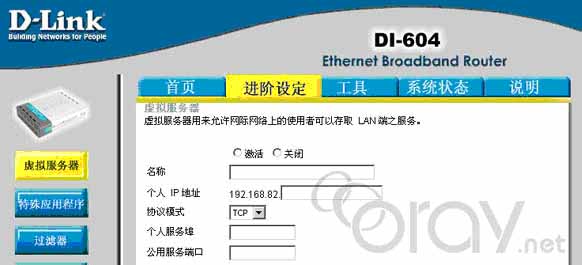 如(ru)果(guo)您(nin)的(de)計(ji)算(suan)機(ji)是(shi)通(tong)過(guo)路(lu)由(you)器(qi)上(shang)網(wang)的(de),除(chu)了(le)上(shang)麵(mian)的(de)操(cao)作(zuo)外(wai),您(nin)還(hai)需(xu)要(yao)在(zai)路(lu)由(you)器(qi)上(shang)做(zuo)端(duan)口(kou)映(ying)射(she),端(duan)口(kou)映(ying)射(she)方(fang)法(fa)根(gen)據(ju)你(ni)所(suo)用(yong)的(de)路(lu)由(you)器(qi),設(she)置(zhi)方(fang)法(fa)有(you)所(suo)不(bu)同(tong),但(dan)設(she)置(zhi)原(yuan)理(li)都(dou)是(shi)一(yi)樣(yang)的(de),下(xia)麵(mian)以(yi)D-Link DI-604 路由器作為例子來講解如何設置端口映射: