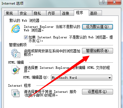 2.進入Internet屬性對話框,點擊上方菜單欄【程序】選項
