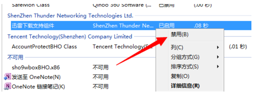 4.在加載項中,找到迅雷下載組件,右鍵點擊將其禁用,保存即可,此時使用IE瀏覽器進行下載,已經使用瀏覽器內部下載工具進行下載。