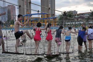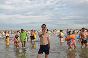 中午十二點多,我們便到站了,大家一起先聚下餐,然後安排好住宿---陽(yang)江(jiang)閘(zha)坡(po)海(hai)寶(bao)度(du)假(jia)酒(jiu)店(dian),酒(jiu)店(dian)設(she)施(shi)俱(ju)全(quan),環(huan)山(shan)繞(rao)海(hai)。大(da)家(jia)稍(shao)做(zuo)休(xiu)息(xi)後(hou),便(bian)急(ji)不(bu)可(ke)待(dai)地(di)往(wang)海(hai)邊(bian)跑(pao)了(le),來(lai)到(dao)閘(zha)坡(po)大(da)角(jiao)灣(wan)海(hai)上(shang)樂(le)園(yuan),這(zhe)裏(li)遊(you)客(ke)甚(shen)多(duo),金(jin)沙(sha)長(chang)灘(tan),海(hai)浪(lang)滾(gun)滾(gun),真(zhen)正(zheng)到(dao)了(le)海(hai)邊(bian),才(cai)能(neng)體(ti)會(hui)到(dao)大(da)海(hai)的(de)遼(liao)闊(kuo)與(yu)磅(bang)礴(bo)。我(wo)們(men)集(ji)體(ti)走(zou)上(shang)沙(sha)灘(tan),這(zhe)裏(li)的(de)沙(sha)質(zhi)不(bu)錯(cuo),軟(ruan)綿(mian)綿(mian)的(de),很(hen)多(duo)人(ren)踏(ta)著(zhe)沙(sha),衝(chong)著(zhe)浪(lang),有(you)的(de)靜(jing)靜(jing)坐(zuo)在(zai)沙(sha)灘(tan)上(shang),享(xiang)受(shou)海(hai)浪(lang)拍(pai)打(da)著(zhe)前(qian)胸(xiong)、後背。海上衝浪嬉戲,坐上摩托艇飛越海浪之上,實在是太刺激,大家玩得不亦樂乎。