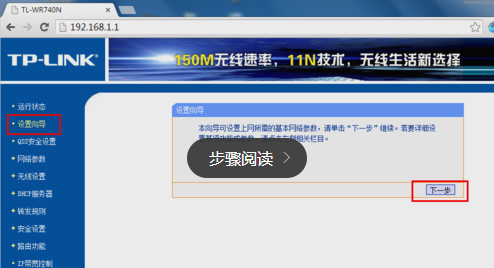 在TP-LINK路由器左邊找到“設置向導”,點擊進入設置向導界麵,在設置向導界麵點擊“下一步”,如下圖: