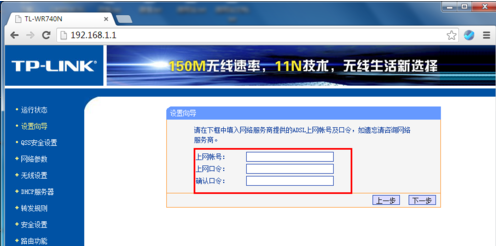 TP-LINK路由器檢測好當前的網絡環境後,進入到上網用戶名密碼輸入界麵,在該界麵中,在“上網帳號”輸入框中輸入網絡服務商提供的上網帳號,在“上網口令”和“確認口令”中輸入網絡服務商提供的上網密碼,點擊“下一步”,如下圖: