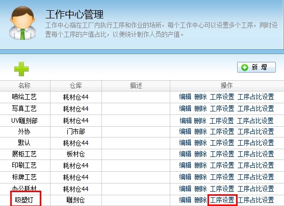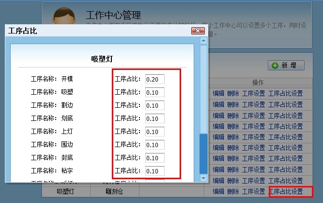 第四步:在工作中心中設置好工序占比,方便後期登記產量,查看員工產值。