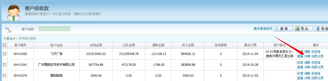 可以查看到所有客戶的欠款,點擊“對賬”可以看到欠款明細並收款