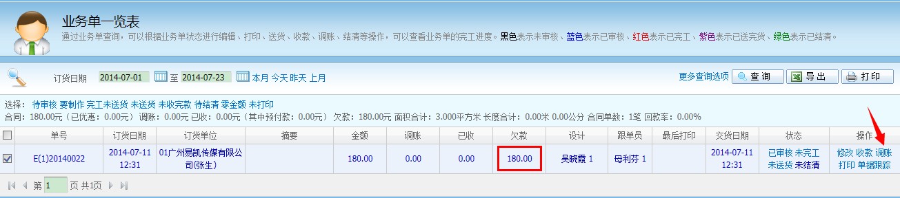 欠款=金額(業務單金額)-已收(開了收款單並審核)-調賬(開了調賬單並審核)