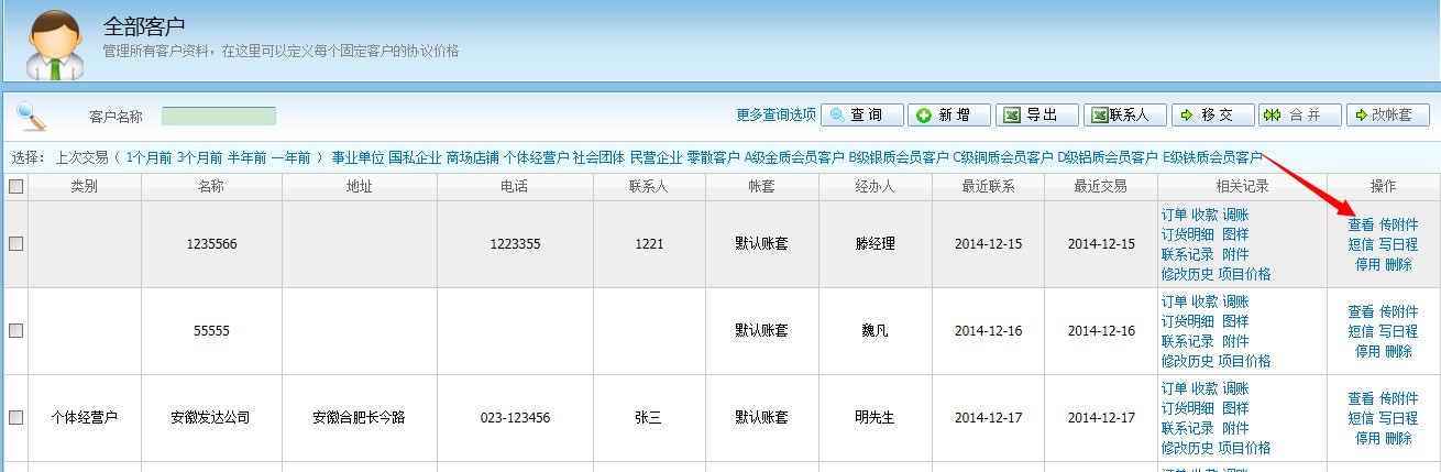 答:在【客戶業務】--【全部客戶】中找到該客戶,雙擊該客戶或者點擊“查看”,就可以重新編輯客戶的各項信息了。