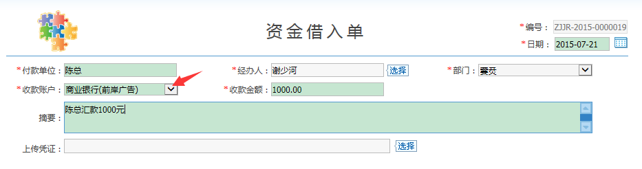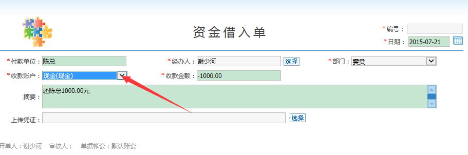 答:這情況相當於幫客戶兌現,可以開資金借入單,然後在“資金借入統計表”中“還款”,還款的時候選擇別的銀行賬號,就可以了。步驟如下圖所示: