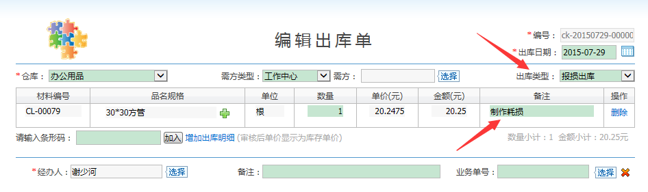 開出庫單時就可以選擇出庫類型了,同時也可以在備注上注明是什麼原因