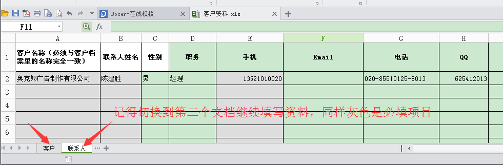 記得切換到第二個文檔“聯係人”繼續填寫資料