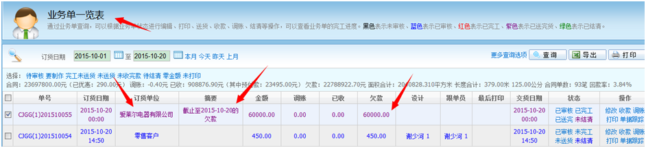 4、保存並審核收款單後,回到業務單一覽表就可以看到收款情況