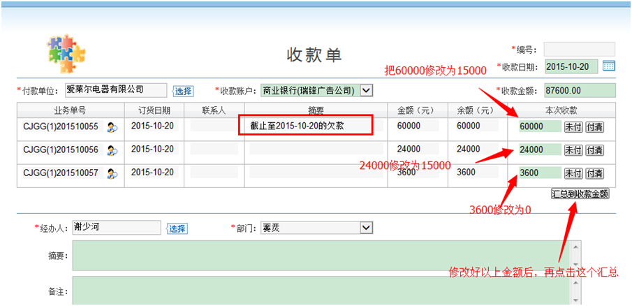 (湖南眾森廣告)問:期初未收款我錄好了,比如愛萊爾電器有限公司欠我公司60000,後期又與愛萊爾電器有限公司發生了業務往來,很多單號,然後後期收回30000,那麼這30000我有15000是收前麵初始數據裏的15000,另外15000是收後期發生的,我該怎麼操作?