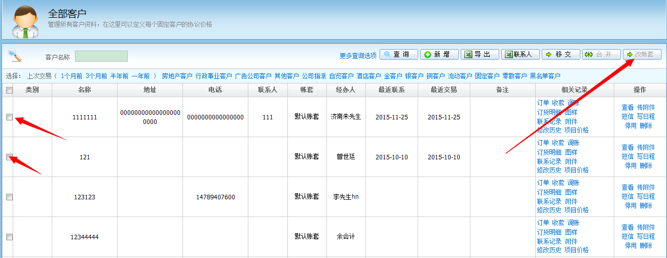 答:登錄上admin的賬號,然後在【客戶業務】--【全部客戶】中,勾選需要更改賬套的客戶,再點擊右上角的“改賬套”就行了
