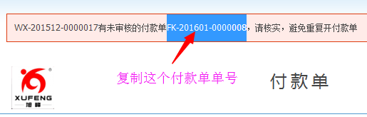 解決方法如下: 複製提示上麵的付款單單號“FK-201601-0000008”,然後在付款單一覽表查詢,把它審核通過就行了。