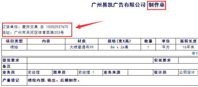 以下是正常的製作單,顯示了訂貨單位、聯係電話、送貨地址等信息。
