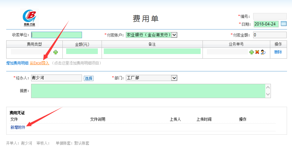同事提交給您的時候您就可以直接用這個表格導入到費用單中,極大提升了登記費用的效率,不用重複性逐條登記。