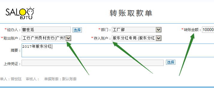 分紅時,進入賬務--轉帳取款單,開轉帳取款單,取出賬戶選擇公司賬戶,轉入賬戶選擇股東分紅: