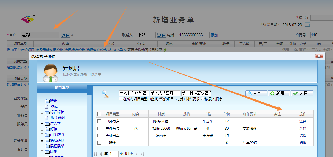 注意模板裏麵灰色是必須填寫的,並且項目類型必須是係統裏麵已錄入的項目類型名字,填寫好導入即可三、後期開單時,如果選了這個客戶,再選擇客戶價格,就會自動帶出事先錄入好的客戶價格可選擇
