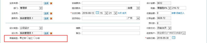 業務單增加單據類型:正常、返工、小樣