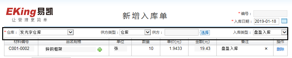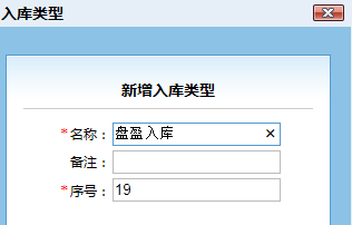 1.進入基礎數據-入庫類型,新建一個入庫類型為:盤盈入庫