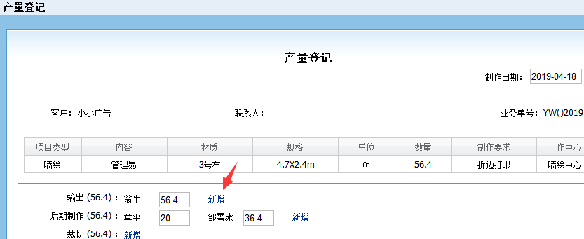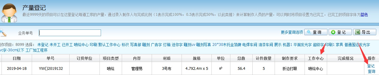 以“噴繪中心”這個訂單為例子,點擊登記
