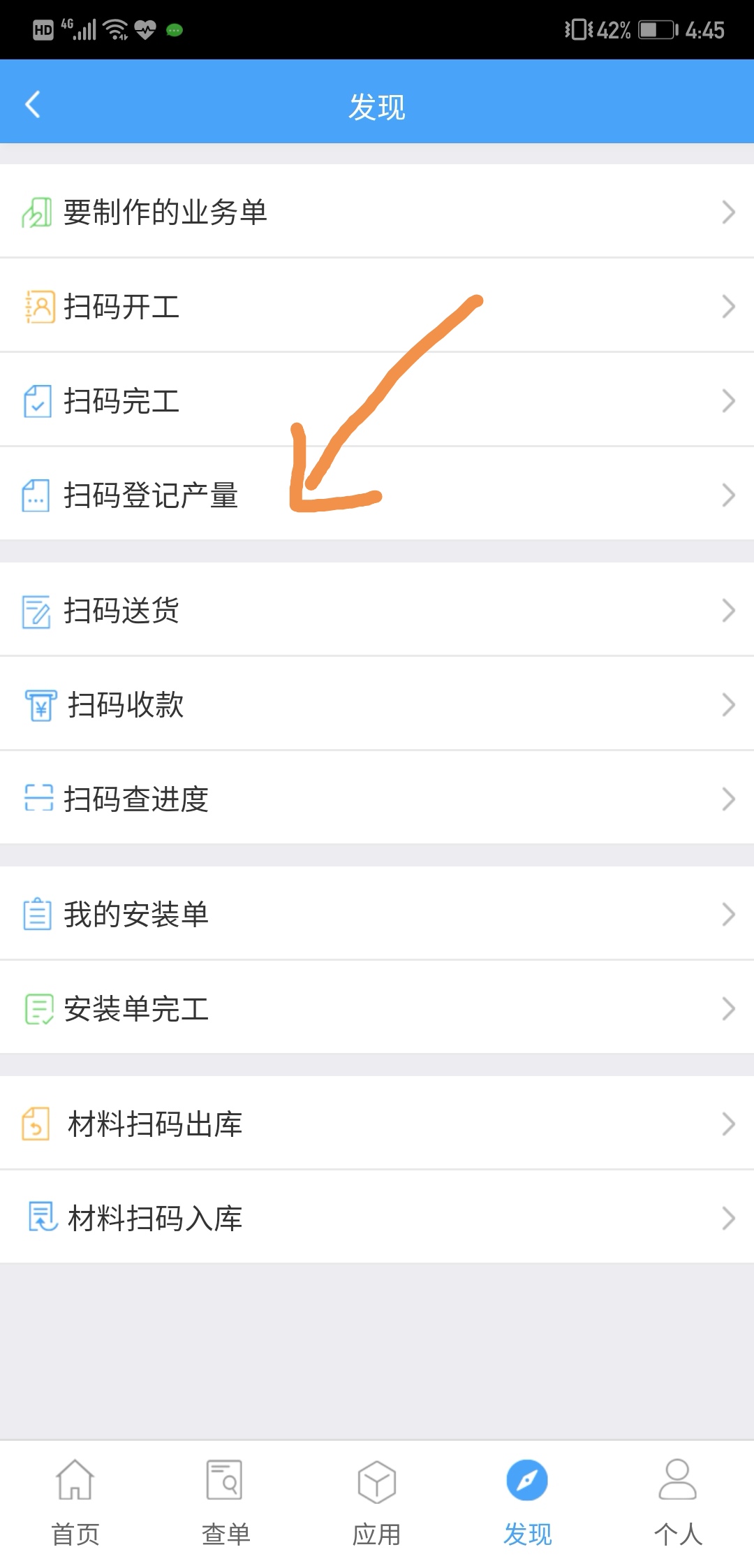 手機app上,點擊發現--掃碼登記產量,掃描上圖打印出來右上角的二維碼