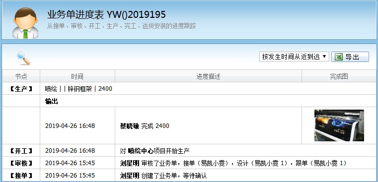 進度裏麵可以查看到這個業務單當前的製作進度,也可以查到上傳的完工圖