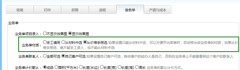 這個是因為在係統設置裏設置了業務單材質從價格手冊選,進入係統管理-係統配置-業務單,找到業務單材質,選擇成手工錄入或者是從從材料中選即可: