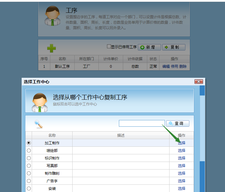 然後再新增一個工作中心,進入工序計件設置,點擊複製,選擇要從哪個工作中心裏麵複製