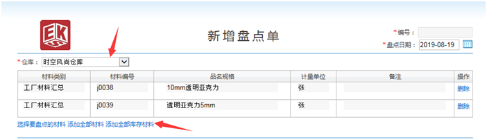 1.開盤點單,選擇要盤點的倉庫--添(tian)加(jia)全(quan)部(bu)庫(ku)存(cun)材(cai)料(liao),也(ye)可(ke)以(yi)手(shou)動(dong)選(xuan)擇(ze)要(yao)盤(pan)點(dian)的(de)材(cai)料(liao)或(huo)者(zhe)全(quan)部(bu)材(cai)料(liao)。盤(pan)點(dian)日(ri)期(qi)非(fei)常(chang)重(zhong)要(yao),盤(pan)點(dian)單(dan)一(yi)旦(dan)確(que)認(ren)後(hou),在(zai)這(zhe)個(ge)日(ri)期(qi)之(zhi)前(qian)的(de)出(chu)入(ru)庫(ku)單(dan)據(ju)都(dou)不(bu)能(neng)改(gai)動(dong),也(ye)就(jiu)是(shi)鎖(suo)定(ding)了(le)這(zhe)個(ge)日(ri)期(qi)之(zhi)前(qian)的(de)庫(ku)存(cun),作(zuo)為(wei)盤(pan)點(dian)的(de)依(yi)據(ju)。