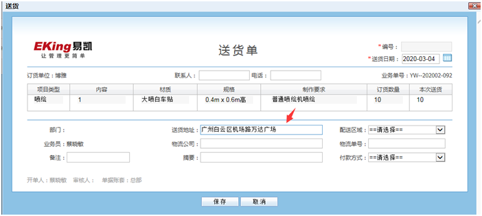 到客戶業務--送貨裏麵,勾選了送貨的項目就會出現在這裏,點擊開送貨單,填寫送貨地址或物流信息等後保存即可