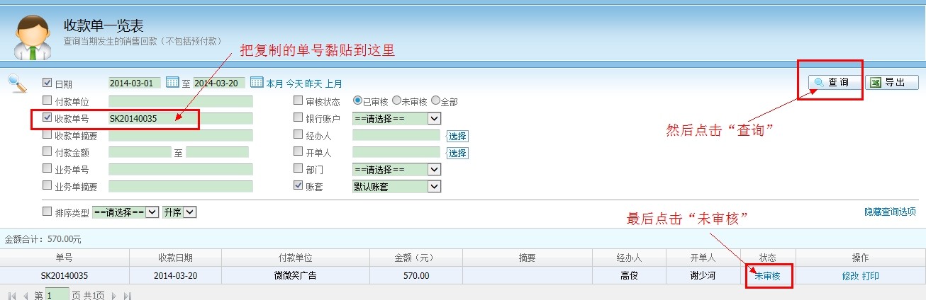 解決方法如下: 複製提示上麵的收款單單號“SK20140035”,然後在收款單一覽表查詢,把它審核通過就行了。