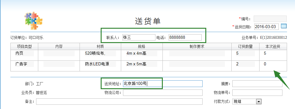先開第一個項目的送貨單,填寫好送貨地址和聯係人信息,把第二個項目的送貨數量設置為0,保存並審核