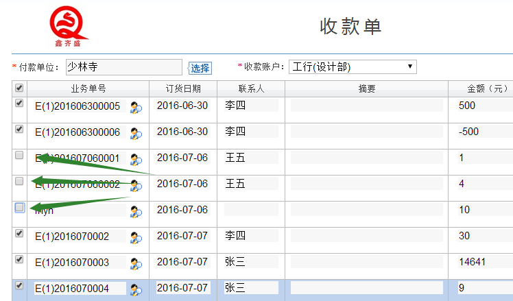 答:客戶業務--業務對賬,對賬單的底部點擊收款,跳出收款單界麵,如下麵的例子:隻收聯係人為張三,李四的業務單的款,隻需要把他們經手的單子勾選上,其它聯係人的單子取消勾選,然後保存審核即可,如下圖: